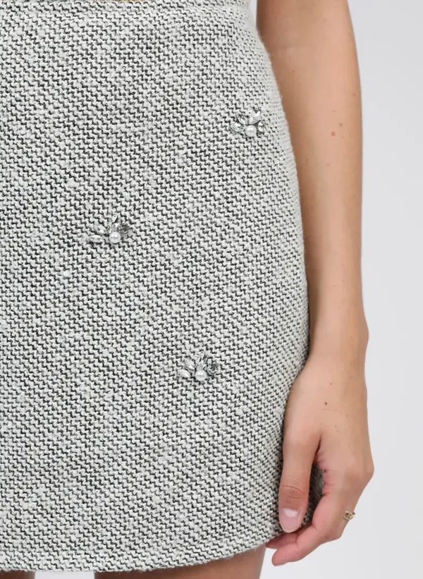 Kort rokje met steentjes erop in een mooie tweed stof. Valt wat kleiner